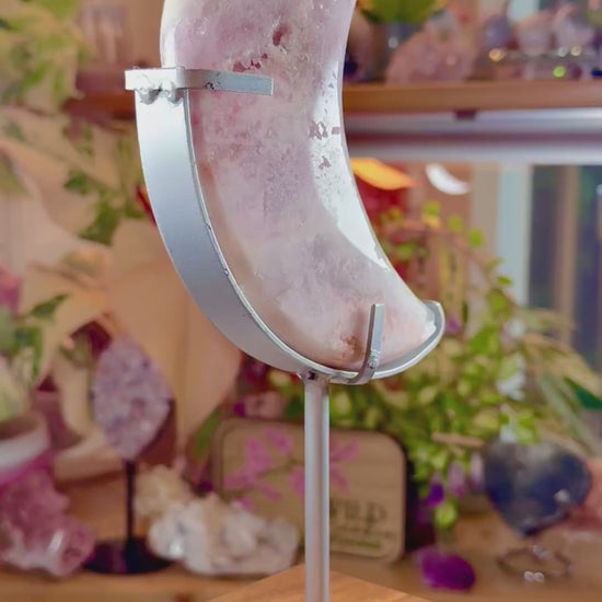 This breathtaking Pink Amethyst crescent moon is a one-of-a-kind statement piece, hand-carved & thoughtfully mounted on a custom wooden base with sleek, brushed metal that cradles it like an offering to the cosmos. Its surface reveals a dreamy interplay of soft rose, blush & lavender tones, washed in natural mineral patterns that feel both grounding & otherworldly. Delicate Druzy Quartz crystals shimmer across its face, catching the light like frost on petals - an effect that draws you in deeper the longer you gaze. Pink Amethyst is a stone of inner calm, emotional restoration & heartfelt clarity. It is believed to harmonize the heart & crown chakras, opening you to gentle self-love, spiritual insight & a steady return to your center during times of grief, stress or transition. The crescent moon shape carries its own quiet wisdom - symbolizing cycles, intuition, feminine strength & the grace of becoming. Together, the materials & design speak to the beauty of the in-between: dusk & dawn, softness & strength, release & rebirth. This piece would make a powerful addition to a sacred space, meditation area or home altar, infusing the environment with sweetness, serenity & subtle lunar magic.