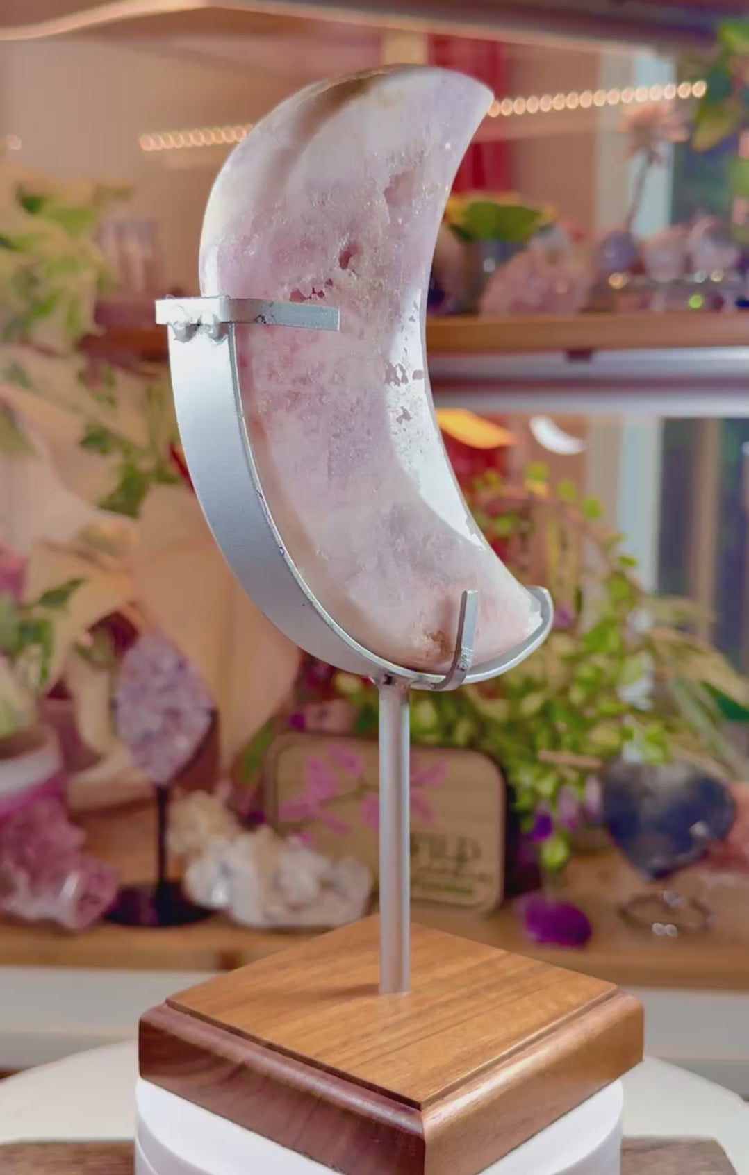 Pink Amethyst Moon • Druzy Quartz • Hand Carved • Custom Wooden Stand